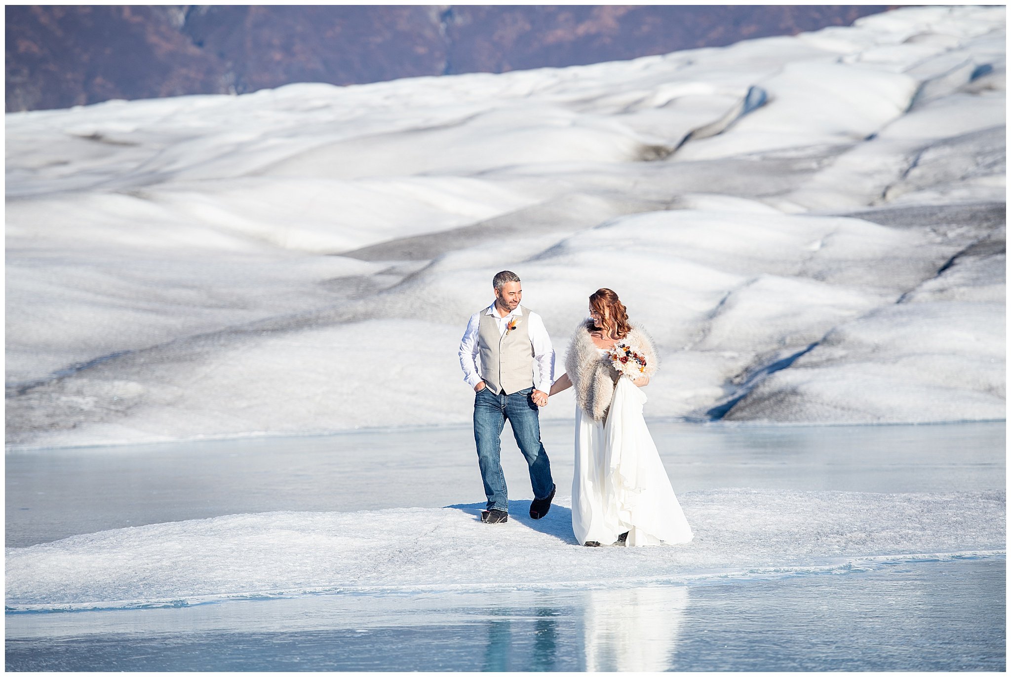 October 21st is a day I will never forget. We arrived at Outbound Heli Adventures and got to talking to the crew that would be taking us to the glacier. A lot of logistics go into something like this… your weight, gear weight, etc. is all calculated to figure out who is going on what helicopter. That day, we flew in three helicopters to the Glacier Pool on Knik Glacier. When the ceremony was over, we took a few photos at the glacier pool, then we hopped in a helicopter and flew to the top of one of the mountains for some mountain-top portraits. What an incredible experience. We flew back threw a valley and it was easily one of the coolest experiences. I never in a million years would have thought I’d have an opportunity like this.